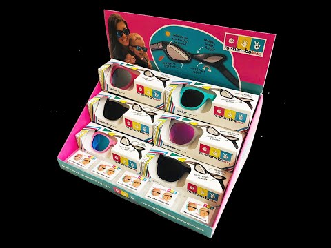 Our Starter Kit includes 45 pairs of our best selling sunglasses in our three kids sizes (Baby, Toddler, Junior) with black polarized UV400 lenses. We also include a free cardboard retail display, bamboo sunglasses display stand, carrying cases and strap kits!